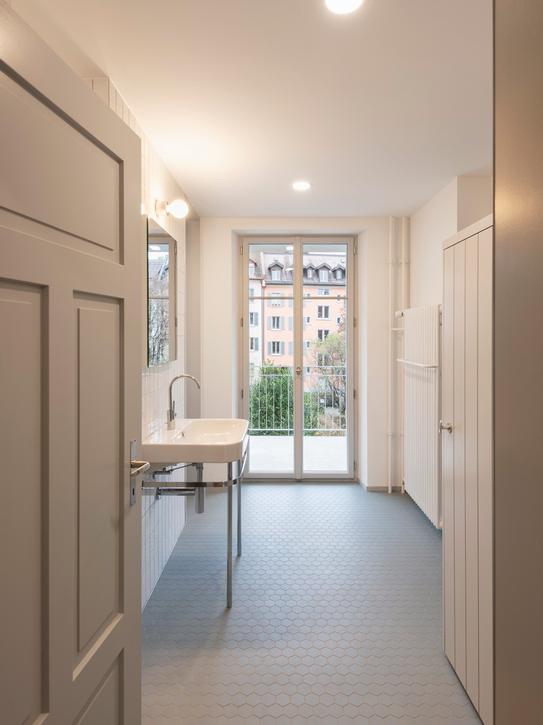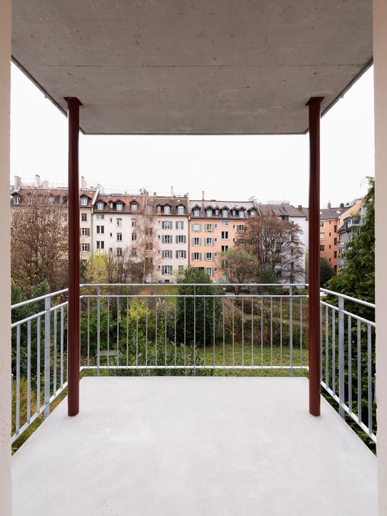 Das beidseitig angebaute Mehrfamilienhaus aus dem Jahr 1905 ist Teil einer Blockrandbebauung und liegt etwas erhöht direkt am Goldbrunnenplatz mitten im Stadtquartier Zürich-Wiedikon. Der weitläufige und sonnige Innenhof mit üppiger Begrünung ist im Inventar der Gartendenkmalpflege aufgeführt. Mit der Gesamterneuerung der acht kompakten Stadtwohnungen wurden die Schlafräume zum ruhigen Innenhof orientiert und mit grossen Balkonen versehen. Die beiden Dachgeschosswohnungen wurden in das 2. Dachgeschoss erweitert und mit eigenen Zugängen zur Dachterrasse ergänzt. Nach dem Umbau ist im Erdgeschoss die Holzofenbäckerei «Vier Linden» mit erweitertem Angebot wieder eingezogen. Fertigstellung und Bezug der Wohnungen ab Dezember 2020.