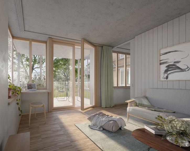 Die in der ersten Hälfte des 18. Jahrhunderts sowie im Jahr 1818 erstellten Reihenwohnhäuser an der Weidstrasse 21-25 stehen unter Denkmalschutz und werden sorgfältig erneuert, während anstelle der ursprünglichen Ökonomiebauten an der Weidstrasse 27 ein Mehrfamilienhaus mit 11 Mietwohnungen entsteht. Die drei mehrgeschossigen Reihenwohnhäuser mit 6.5 bis 8.5 Zimmer und privatem Garten eignen sich für grosse Familien. Im Neubau mit seiner Verandaerschliessung sind vorwiegend 3.5 und 4.5 Zimmer Wohnungen geplant. Der Holzhybridbau greift die architektonischen Elemente des historischen Bestandes auf und bildet den Abschluss des hofartigen Aussenraumes, welcher als gemeinsamer Begegnungsort dienen soll. Dadurch wird das 2’679 Quadratmeter grosse Areal qualitätsvoll weiterentwickelt, wobei der Ensemblecharakter im Zentrum steht. Baubeginn Anfang 2024, Fertigstellung und Bezug Sommer 2026.